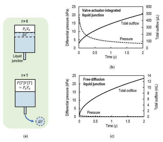 (a) Schematic view of assumptions when estimating the outflow over time from the flow rate; (b) estimation of the electrolyte outflow and differential pressure over two years when the VAIRE is used; (c) estimation of the electrolyte outflow and differential pressure over two years when the free-diffusion liquid junction reference electrode is used.