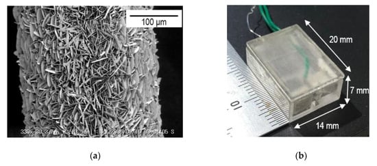 Bare Ag/AgCl electrodes were fabricated electrochemically. The procedure is as follows. First, a silver wire (diameter of 0.20 mm) was rinsed with acetone and then deionized (DI) water, followed by 4% HCl and then DI water again. Through this process, any organic and inorganic contamination on the silver wire was removed. Second, the silver wire as the anode and a platinum wire (diameter of 0.20 mm) as the cathode were immersed in a 1.0 M KCl solution. They were placed 10 mm apart, and both were dipped 10 mm into the solution. Finally, by applying a voltage of 3.0 V between two wires with a source meter (Keithley 2460-EC, Tektronix, Beaverton, OR, USA) for 30 min, AgCl was deposited on silver wire. The surface of the fabricated Ag/AgCl electrode is shown in Figure 5a. This image was taken with a scanning electron microscope (VE-8000, KEYENCE, Osaka, Japan). Many sheets of AgCl on the Ag wire were confirmed, which increases surface area and potential stability [,].