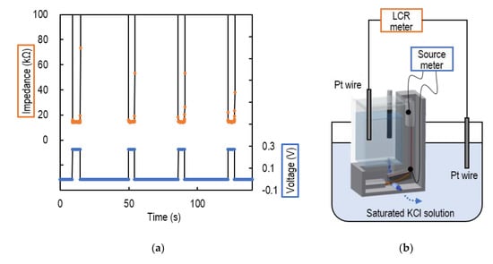 The operation of the valve was evaluated by measuring the liquid junction impedance when the voltage was applied to the SMA of the VAIRE. Figure 6a shows the applied voltage and measured impedance. Figure 6b shows the schematic view of a set-up of this experiment. The impedance decreased to about 15 kΩ when the voltage was applied to the SMA. Since the input impedance of the source meter used for the pH measurement is 10 GΩ, the impedance was negligibly small. When the voltage was reduced to zero volts, the impedance increased and became isolated. It was confirmed that the valve was switching between conduction and insulation of the liquid junction.