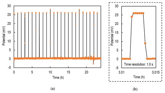 During the measurement, the potential was about 26 mV once every hour, which indicated that the SMA valve switched between insulation and conduction for 24 h. The maximum response time was 2.0 s as shown in Figure 7b. The upper and lower outliers are considered to be noise during the valve opening and closing. The standard deviation of the potential, excluding outliers, was 0.29 mV. This value is expected to last as long as the electrolyte remains. Therefore, the standard deviation of the pH sensor applied the VAIRE was estimated at the pH of 0.005 for 2.0 years.