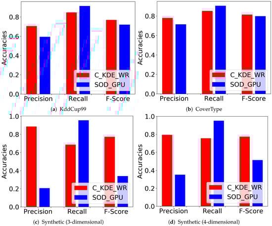 We set to and k to 100 in C_KDE_WR. Three retrospects () are required to finalize a true outlier detection. is selected as forgetting factor and the window size is set at 1000 for all datasets (synthetic and real-word). We performed the experiments 30 times independently and in each case, we shuffled the outlier points evenly within the inlier points. Figure 1 illustrates the comparison of results between the two algorithms. Specifically, Figure 1a shows the average accuracies of C_KDE_WR and SOD_GPU, in terms of Precision, Recall and F-Score on KddCup99 dataset. Our proposed C_KDE_WR algorithm performs better in terms of Precision but slightly lower than SOD_GPU in terms of Recall score. The results on CoverType and synthetic datasets are very similar as we can see from Figure 1b–d.