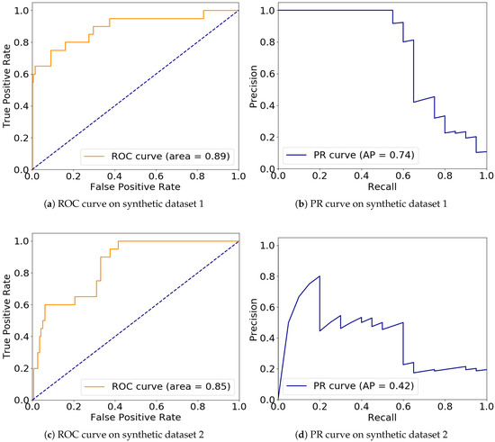 With , which is the maximum parameter setting, we draw the ROC curve and PR curve on both synthetic datasets at different threshold settings in order to prove its efficiency. Figure 3 illustrates results of these metrics with also their AUC ROC values and AP (Average Precision) values shown in the figure legends.