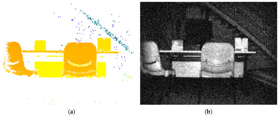 Notably, in a passive camera, the sensor is exposed to the light during the shutter opening period. The depth information can be triangulated through the motion of the camera or using two cameras with the calibrated extrinsic parameters. Contrarily, the ToF camera illuminates a modulated light and observes the reflected light. The phase shift between the illuminating light and the reflected light is measured and translated to distance [21]. Since such a ToF camera can measure the distance in “one shot” without any post processing, it enables good resilience to any change of environmental brightness [22]. The output of the ToF camera provides a depth image and an NIR intensity image simultaneously (Figure 1).