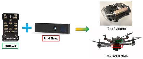 Our sensor platform consists of a pmd technologies Flexx ToF camera and an IMU sensor embedded in a Pixhawk v2 flight controller, as shown in Figure 2. The Flexx ToF camera has a resolution of 224 × 171 pixels and a depth detection range of 4 m with a frame rate set to be 15 Hz. The Pixhawk v2 IMU updates at a rate of 250 Hz. The times of the two sensors are synchronized by the software and the installation geometry of the camera and IMU is represented by (1).
