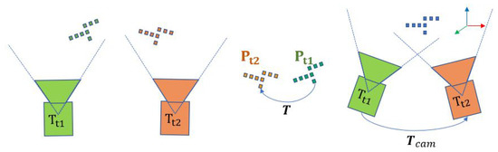 The frame to frame alignment can also be made through the transformation matrix , which aligns two point clouds as . Combining it with Equation (5) and Equation (6), we could find the motion of the camera equal to the inverse of the point cloud transformation matrix (Equation (7)). In another word, the camera motion can be derived from the point cloud alignment.