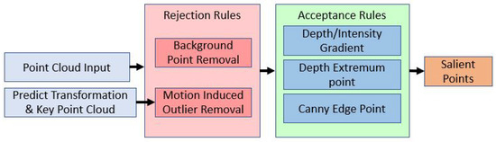 The resolution of ToF camera in this study is 38K, i.e, every point cloud image contains 38K points. It is impossible to align such a huge amount of points on an embedded computer in real time. Therefore, several criteria to select the salient points from the raw image are applied in this work. As shown in Figure 4, these criteria can be divided into the rejection and acceptance groups.