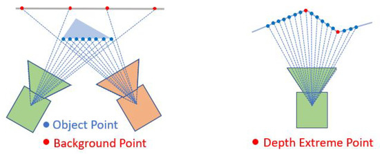 As shown in Figure 5, the depth extreme points are considered to contain 3D features and thus need to be select as salient points. The extreme point of the depth (the local maximum of minimum of the depth) on a continuous plane can be found by a zero depth gradient or . As the cloud points are discrete, the extreme points are detected by calculating monotonically the gradient in an interrogation window of 5 × 5 pixels. Thus, the points which satisfy Equations (17) and (18) are considered to be the extreme points in the u direction. Similar procedures are conducted to extract the extreme points in the v direction.