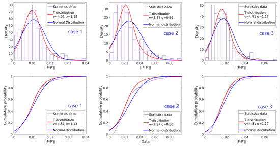 In Kerl’s work [15], intensity residuals are found to follow the t-distribution approximately. We measured the position error distribution of the point pairs from two images. The results of three different cases are shown in Figure 6. In first case, the camera is fixed and the point cloud is captured twice. The second and third cases show the position error distributions of the point clouds by a moving camera with and without running four ICP loops, respectively. As shown in Figure 5, the t-distribution approximates the error distribution better than the normal distribution in every case.