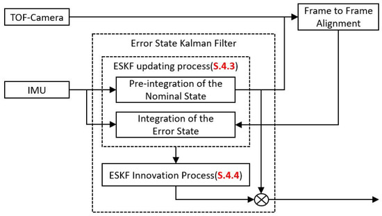 Workflow of the Error State Kalman Filter estimator by using the ToF camera alignment results and the IMU data.