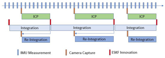 where ⊗ indicates quaternion multiplication. In the ESKF fusion, the inputs are divided into 3 parts: , and . The measurement input contains the readout from the gyroscope and the accelerometer . The noise impulse input is the assumed IMU noise and the observation includes the rotation and translation from the ICP alignment process . According to the IMU measurement module, every component in the noise impulse input follows the Gaussian distribution with a zero mean value. The purpose of doing so is intended to separate the error part from other parts and let the error remain in the error state. The storage in the nominal state is always the best fusion result. The ESKF workflow can be divided into two steps: (1) the ESKF updating process driven by the IMU and (2) the ESKF innovation step from the IMU (see Figure 7), detailed as follows: