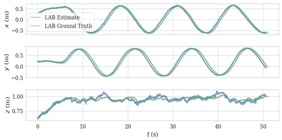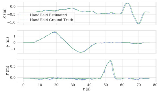 In the handheld test, we held the VIO platform and successively moved in the x, y, and z directions. This generated a good agreement between estimated trajectory and ground truth, as can be observed in Figure 9 and Figure 10. The length of the trajectory is 12.86 m and ATE and RPE of the estimated trajectory is 0.047 m and 0.017 m/s, respectively.