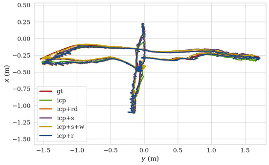 Based on this dataset, Figure 11 shows the comparison of ground truth trajectory with those using algorithms of the conventional ICP (icp), the ICP with the salient point selection criteria (icp+s), the ICP with the salient point selection criteria and robust weighting factor (icp+s+w), the random sub-sampled based ICP (icp+rd) and the ICP with the RANSAC pipeline (icp+r) [29]. The corresponding accuracy and processing time of each algorithm are also evaluated and listed in Table 5. It can be seen that the conventional ICP workflow can provide the accurate pose estimation but the processing time is unfavorable to the real-time applications. Both the random sub-sampling based ICP and the ICP with our salient point selection method can dramatically reduce processing time. Nevertheless, the former induced a large ATE error. The ICP with the RANSAC method achieves best in the RPE error but with the largest ATE error and a second largest average processing time. Notably, the conventional ICP, icp+s, icp+r, and icp+rd are all with weights for points set to equal. Together with the robust weighting factor (the weights for points set to the t distribution), the proposed method (icp+s+w) in this work reaches almost the same ATE accuracy and 26% improvement in RPE accuracy when compared with the conventional ICP. In the meanwhile, the processing time of icp+s+w is only 25% that of the conventional ICP. The superiority of icp+s+w over other methods is clearly illustrated.