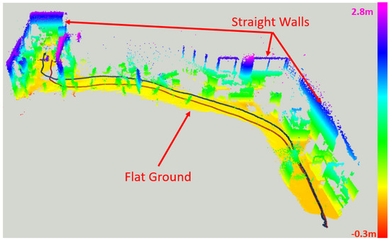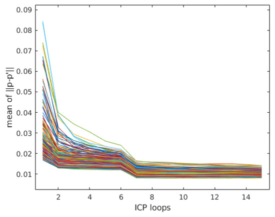 Figure 13 demonstrates that the error of mean in each frame (different lines) decreases with the increase of ICP loops. In general, three (no motion) to 15 ICP loops were performed and the motion prediction of IMU provided the initial guess of the ICP algorithm. After about ten loops, the mean almost reach the minimum value. The refinement process continues until the corresponding transformation change () is relatively small or the maximum loops (15 in our experiment) are reached.