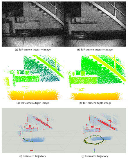 Most of the methods described above use passive cameras and were developed for use under different experimental environments in daylight, meaning that camera exposure for good image quality is not a problem. However, many real application scenarios, such as indoor industrial facility inspection and search and rescue missions inside earthquake- or explosion-damaged buildings, are much more challenging than the benchmark case of the MH 05 difficult in EuRoC MAV Dataset [20], as these are in poor lighting conditions. In order to achieve perception in such dark or changing ambient light environments, we replace the conventional passive camera with an active ToF camera in this study. The pros and cons of using the conventional passive camera and the active ToF camera in motion estimation are listed in Table 2.