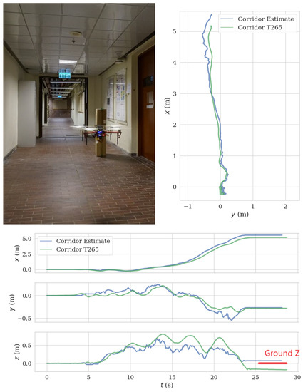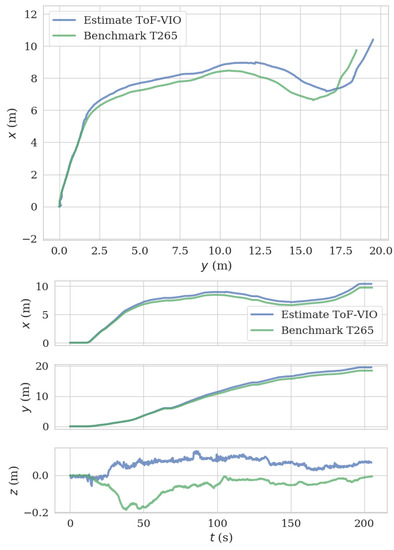 We mounted the ToF–VIO sensor and a Realsense T265 sensor on the UAV platform and conducted a field test in a corridor. The UAV took off, flew straight along the corridor, and landed 5 m in front of the takeoff position. The trajectory length including takeoff and landing is 8.23 m. Figure 17 presents the comparison between the estimated trajectory generated by the current ToF–VIO sensor and that by the Realsense T265 sensor. In general, the agreement is good, especially in the early period. The ATE and RPE between ToF–VIO and T265 is 0.12 m and 0.029 m/s, respectively. As the UAV took off and landed at the same ground level, our ToF–VIO has better estimation in the z-direction.