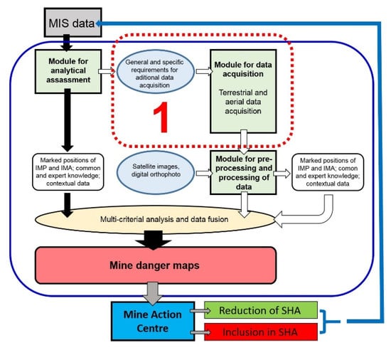 The modules can be used together or individually. Input includes data from the mine information system, expert knowledge, and airborne, satellite and contextual data (Figure 1). AIDSS is a unique mine action technology that provides a successfully operational system combining remote sensing with advanced intelligence methodology. It is a validated operational solution for non-technical surveys in humanitarian mine actions [] proposed to mine action centres worldwide, because it is adaptable to specific terrains and situations. The outcomes of this system are successfully detected and confirmed geographical positions of indicators of mine presence and indicators of mine absence, a better (re)definition of a suspected hazardous area, and thematic maps (mine danger maps) []. Therefore, the AIDSS module for data acquisition is a very important part of the whole system, because the processing of collected data should provide useful results, within the AIDSS methodology, for decision-making on suspected hazardous area re-definition.