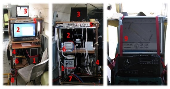 Control table with module control system component inside Mi-8 helicopter: (1) personal computer (PC) for manipulation with Nikon D90 and Photon 320; (2) monitor for PC and industrial controller (switching is performed as needed during recording); (3) laptop for manipulation with inertial measurement unit (IMU); (4) industrial controller for manipulation with MS4100 and ImSpector + PixelFly (not part of the first system configuration, built in 2009); (5) junction box of the electric power system; (6) converter from 28–30 V direct current (DC) to 220 V alternating current (AC) for PC and monitor; (7) large battery (210 Ah, 75 kg) for power supply; (8) cables for connection with sensor; (9) navigation monitor located in the cockpit.