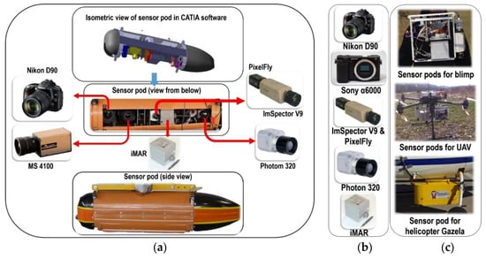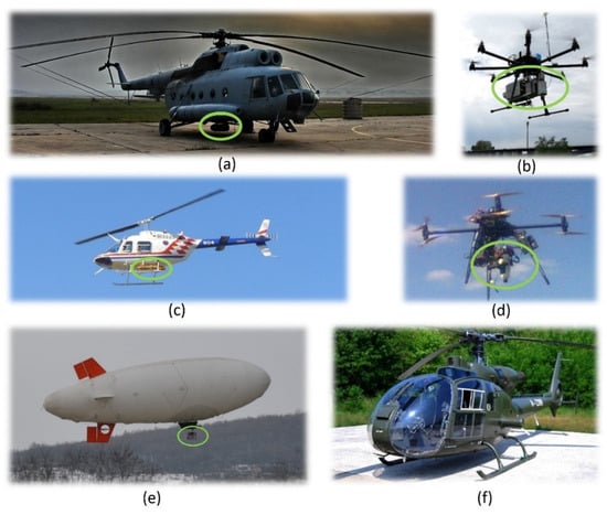 Platforms for aerial data acquisition system of AIDSS and sensor pods (in the green ellipses) on (a) Mi-8 helicopter, (b) remotely piloted aircraft system (RPAS) 8 ZERO, (c) Bell-206helicopter, (d) RPAS X8 MK, (e) blimp, and (f) Gazela helicopter.