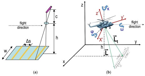 In order to scrupulously describe the mission planning in remote sensing, it is necessary to analyze the passive sensors according to their data acquisition geometry, which is generally based on the central perspective collinearity []. The image projection principle (ideal imaging process of a real object onto the image plane) is based on a geometric principle of the central perspective. The footprint of the image frame on the ground is closely connected to the relative altitude and the field of view (FoV). Based on the parameters of the camera (image resolution, pixel size, focal length) and flight height, the theoretical values of the GSD can be calculated, according to [] as: