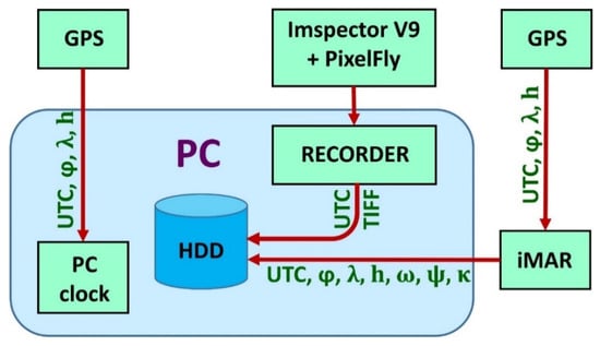 The system for navigation, determining the position and orientation of the system in space, consists of a single-frequency GPS device integrated with an inertial measurement unit (IMU) iVRU-RSSC by iMAR GmbH, and additional GPS units arranged in or on the platform. IVRU-RSSC is a triple-axis inertial system with three mutually perpendicular MIL-MEMS gyroscopes for determining the angle elements of the spatial orientation of the sensor, and 3 MEMS-accelerometers to determine the acceleration components along all three axes. The device has an integrated microprocessor for 16-bit digitalization of data from the sensor and deviation correction, to improve the accuracy of all measured elements. The GPS data are used primarily to correct navigation solutions acquired from the inertial system. Although the internal IMU working rate is 200 Hz, for this purpose, the elements of current position and sensor orientation in relation to the referential WGS84 coordinate system were stored with a frequency of 20 Hz. This allowed high-quality fluctuation and raw element bias correction using the internal processor. On the other hand, the volume of redundant data was reduced, and further processing was made easier, since the frequency of imaging of the ImSpector V9 sensor is 10 Hz. The elements of the external orientation of the platform related to the WGS84 coordinate system are expressed in ellipsoidal coordinates φ, λ and h on the GRS80 ellipsoid. Alongside the IMU, a separate GPS device was used with an aerial to synchronize the computer time with GPS time (UTC).