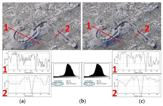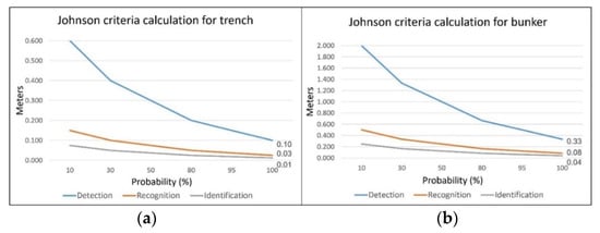 The interpretability of images is determined objectively and subjectively. A subjective assessment of the usability of images is done by an experienced scene interpreter, by visually reviewing the images with the use of contextual data. Therefore, a robust method is needed to allow an objective evaluation of the image quality which will correlate well with a visual, subjective judgement. For the objective determination of the interpretability of images, the image quality measure (IQM) [] was used, with the Johnson criteria []. The IQM method is based on an analysis of image spectral density. Based on IQM values, National Image Interpretability Rating Scales (NIIRS) values are calculated, which provide the measure of interpretability, or usability. The image quality and interpretability are described by creating a NIIRS [] scale (based on an analysis of the interpreter’s results), ranging from 1 (an image with the lowest interpretative quality) to 9 (an image with the highest interpretative quality). This has been used for over 20 years in the aerial imaging community (it was developed for military purposes) and was later adapted for civilian needs []. The concept underlying the NIIRS is that imagery analysts should be able to perform more demanding interpretation tasks as the quality or interpretability of the imagery increases. The method is not standard or developed for all types of objects for civilian use but gives a widely accepted assessment of the usability of images. The Johnson criteria, initially formulated as a method of predicting the probability of target discrimination, were created in 1958 []. The model uses the synergy of knowing the origin of how the image was created in the sensor and the interpreter’s experience and has been analyzed in detail in []. Johnson characterized the probability of detecting an object based on its actual resolution in the image. The concept has been substantiated by its own findings. He found that as the number of resolvable cycles across a target increased, so did the probability of an observer successfully locate a target. The Johnson criteria are the number of line pairs across a target needed for a group of observers to have a 50% possibility of discriminating the (target) object. From 1958 up to the present, this prediction and metrics model has been improved, although there is still no model that accurately predicts target detection in all inclement weather situations []. However, the method was used in AIDSS only to assess interpretability before visually interpreting the images, done by human interpreters, who make final decisions on target discrimination. That is, they determine the flight height in order to ensure the necessary size of GSD for the detection, recognition or identification of objects of interest with certain sensors by human interpreters. The methodology for extracting indicators of mine presence from hyperspectral VNIR images is described in [,].