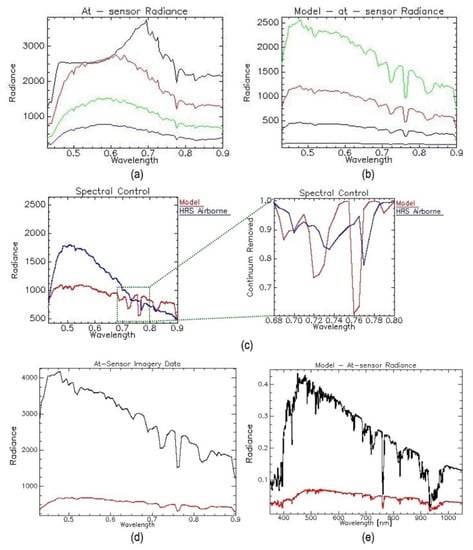 In the quality assurance procedure, MODTRAN was used to reconstruct the atmosphere above selected targets with ground-truth measured reflectance, and then compare the results with the at-sensor radiance obtained []. Two indices, Rad/Ref (at-sensor radiance divided by ground truth reflectance) and RRDF (radiance to reflectance difference factor) indices were used to spot faulty performance of the sensor prior to the next data processing stages.