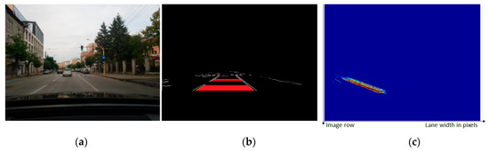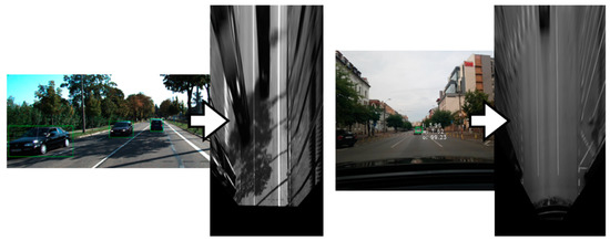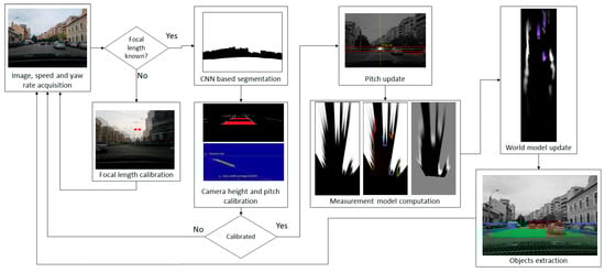 Using the calibrated parameters, the CNN-based segmented image is mapped in the bird’s-eye view, and the scans delimiting the road and the obstacle areas are identified and refined. Based on these scans, the probabilistic measurement model is generated. The whole process is described in Section 3.2.