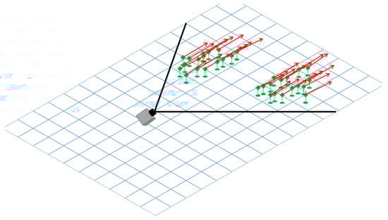 The particle-based dynamic occupancy grid [22,23] provides an efficient and intuitive method for representing the occupancy probability of a cell, by means of dynamic world building blocks called “particles”, as seen in Figure 2. The number of particles assigned to a grid cell is equivalent to the probability of the cell to be occupied by an obstacle, and each particle has a speed vector, allowing the population of the particles in the cell to also depict a multi-modal probability density of the obstacle’s speed. The inference mechanism follows the typical prediction–measurement–update tracking cycle, the prediction being achieved by moving particles from one cell to another based on their speed vector, and the measurement based update being achieved by multiplying, creating or removing particles based on the agreement of the prediction with the measurement data.