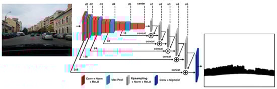 For training the network, we used the state-of-the-art datasets for semantic segmentation: Cityscapes [24], KITTI [3], Berkeley Deep Drive [25], and Mapillary Vistas [26]. We used a total of more than 31,000 images, from all four datasets combined. The images with less than 2500 annotated road pixels were filtered out, resulting in 28,000 images for training and 3500 images used for validation during training. All images and labels were scaled down to 256 × 256 pixels. The main objective being to determine the drivable road area, we have only used the road class from the datasets, meaning that the image pairs used for training have the following structure: the input image (color image of the road scene, three channels) and the label image (single channel, with the road annotated as 255, and the background/non-road annotated with 0).