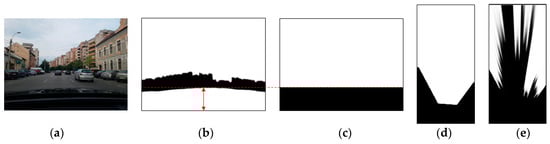 Transforming the perspective color image into usable measurement: (a) Perspective color image; (b) segmented image, highlighting the obstacle areas (white) and the free area (black); (c) useful area mask; (d) grid visibility mask; (e) bird’s-eye view of the segmented image.
