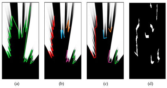 The first step is to transform the image into scans, an array of distances computed for each viewing angle, from 0° to 180° (the area in front of the camera). After the distance from the camera to the nearest obstacle structure is computed for every angle from 0° to 180°, only a subset of these angles will have a valid distance. For the angles that are outside of the camera’s field-of-view, and for the angles that cast rays that do not meet obstacles in the XZ range defined by the bird’s-eye view transformation, the assigned distance will remain the invalid infinity (a very large numerical value). The end points of the rays will form polygonal lines, which look like the ones in Figure 5a. The contours look fuzzy, due to the problem of incomplete contact between the obstacle and the road, and due to segmentation errors that are sometimes amplified by perspective remapping.