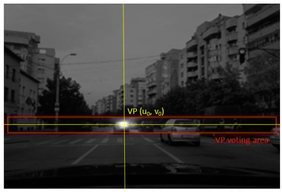 After the calibration of the focal length, the acquired images are submitted to a convolutional neural network for semantic segmentation, separating the road areas from the obstacle areas. The road areas are further processed by identifying the lane delimiter markings, which are then used for height and pitch angle calibration, as described in Section 3.5. The pitch angle is further refined by computing the image’s vanishing point, which is also used for computing the camera’s yaw angle with respect to the longitudinal axis of the host vehicle.