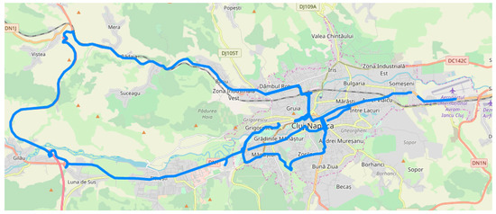 The mobile device’s main camera was used for acquiring images of the traffic scene. We used the main camera that is usually placed in the back of the device due to its better sensor and resolution. The other sensorial data was acquired using the available Android API’s and the data is saved on the internal storage in a text file using the current timestamp as the name. The same name was used when saving the current image/frame from the camera. Therefore, the sequences can be analyzed both locally on the device and also offline, on better hardware during the development of the algorithms. We acquired a total of over 115,200 images grouped into 27 sequences in various weather conditions, during different moments of the day and, in the city, rural road and highway scenarios. A figure containing all the GPS traces from the recorded trips in our home city and its surroundings is illustrated in Figure 12.