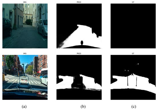 Examples of wrong annotations in the CityScapes [24] and Berkeley Deep Drive [25] datasets. Left column, (a)—input image, center column, (b)—prediction, right column, (c)—ground truth images containing errors.