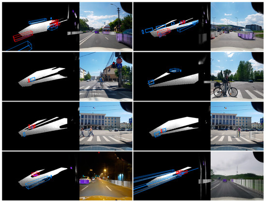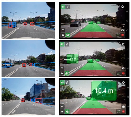 Screenshots of the application are shown in Figure 16. The system is able to detect cars, pedestrians, bicyclists, and even continuous structures like fences, in multiple scenarios and weather conditions.