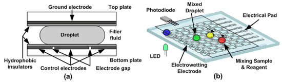- Fair, R.B.; Khlystov, A.; Tailor, T.; Ivanov, V.; Evans, R.D.; Srinivasan, V.; Pamula, V.; Pollack, M.G.; Griffin, P.B.; Zhoud, J. Chemical and biological applications of digital microfluidic devices. IEEE Des. Test Comput. 2007, 24, 10–24. [Google Scholar] [CrossRef]