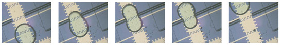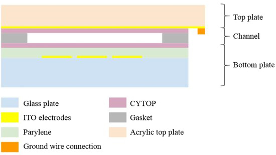 The bottom plate and the top plate (Figure 3) of the microfluidic chip are fabricated separately, and later pressed together with a gasket layer put in between. The bottom substrate is on a 500 µm thick borosilicate glass wafer. 140 nm indium tin oxide (ITO) is sputtered and patterned into 0.7 mm × 0.7 mm electrodes with 0.05 mm separation space between each. Then a 1.3 μm thick Parylene C is deposited as the dielectric layer. Finally, 90 nm spin-on CYTOP® (AGC Chemicals, Exton, PA, USA) covers the entire surface and the chip is baked at 100 °C followed by 190 °C, each for 10 min. This allows glass transition of CYTOP® to happen.