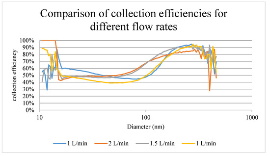 Collection efficiency as a function of particle diameter for three different flow rates and a repeat measurement at 1 L/min.
