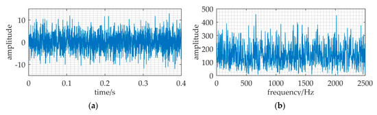 The result of RFSR applied to the ULB signal detection when the sampling frequency is fs = 150 kHz, and the sampling data length is N = 1500. The re-scaling ratio of RFSR is R = 3.75 × 106. In addition, the other relative parameters: A = 0.15, f = 37.5 kHz, a = 1, b = 0.344, D = 0.9. (a,b) are the waveform and frequency spectrum of the output.