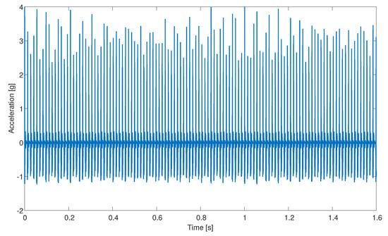 The model outputs acceleration values in the bearing’s radial direction, i.e., the gravitational direction. In this paper, we call those values “synthetic raw data”. The raw data values change in each simulation depending on the state and the conditions of the bearing. These parameters could be controlled and obtained as input to the model. In particular, the parameters that can be controlled are the spall size, the rotating speed of the bearing (Rounds Per Second (RPS)), and the load.