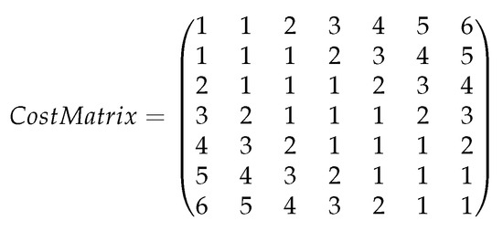 We measure the classification models with standard machine-learning metrics: accuracy, precision, recall, F1-score, and AUC. Computing these evaluation metrics for multi-class should take into consideration not only whether the instance is classified to the correct class but also the distance of the classification from the real class. Specifically, in the bearing spall-size classification, when classifying an instance of spall size 3 mm, we may want to give a greater penalty for a classifier that classifies it to a spall size of 1 mm than a classifier that classifies it to 2.3 mm. The greater the difference between the real and predicted spall sizes, the greater the penalty. In Equation (3), we present the computation of this penalty, and in Figure 5, we present the cost matrix based on the penalty computation. The rows represent the predicted spall size, and the columns represent the real spall size. For instance, when classifying a spall size of 1 mm to 5 mm, the penalty is 6 (upper-right corner).