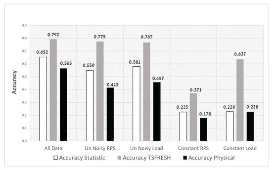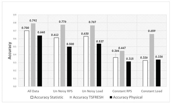 To further analyse the impact of the penalty given by the cost matrix (Figure 5), we ran the same experiments with no penalty. Figure 9 presents the accuracy for the different configurations. It can be seen that the accuracy of the classifier using the TSFRESH features remains almost the same as the results with penalty (Figure 8). The accuracy by using the statistical features is a little bit better compared to Figure 8, but the accuracy by using the physical features is significantly increased in the constant load configuration. In this configuration, the accuracy is even better than using the statistical features. A reasonable explanation is that the classifier with physical features has less false classifications than the classifier that uses statistical features. However, in case it classifies falsely, the error is high and so is the penalty.