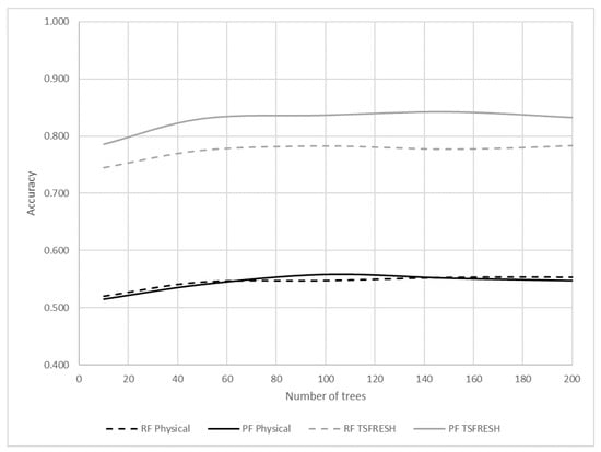 In RQ4, we asked about the improvement of our Probability Forest algorithm. Figure 10 presents the accuracy of the classifiers when training on all data as a function of the number of trees in the Random Forest and the Probability-Based Forest classifiers. The dashed curves represent the Random Forest classifier and the solid curves represent the Probability-Based Forest classifier. The grey curves represent the TSFRESH feature set, and the black curves represent the physical set of features. It can be seen that the Probability-Based Forest algorithm using the TSFRESH feature set achieves the highest accuracy (0.842), significantly better than Random Forest (0.792). There is no significant difference between the algorithms when training with the physical features.