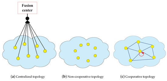Based on the topology of communication, there are three basic structures of IWSN: centralized topology, non-cooperative topology, and cooperative topology, which are shown in the Figure 1. Figure 1a is centralized topology. Figure 1b,c are non-cooperative topology and cooperative topology respectively.