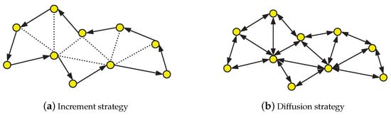 For the incremental strategy, if there is a cycle topology in the intelligent network, the number of agents along the trajectory is from 1 to N. In this strategy, the signal is transmitted from one intelligent node to the next node in the cycle edge until all nodes are obtained. The topology of incremental strategy is shown in Figure 4a. Thus, the entirely distributed solution of increment strategy can only access to signal from its local neighbors [,].