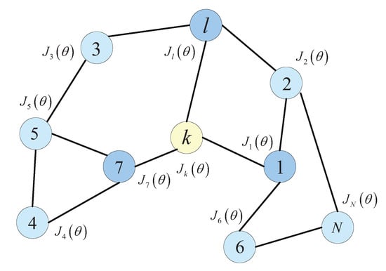 Consider an IWSN with N intelligent node (Agent) over distributed spatial domain, which labeled and is shown in Figure 3. The topology of an IWSN is defined as an undirected graph. Thus, let G be an undirected graph. The V and are defined set of nodes and edges respectively. Agent l is called a neighbor of agent k if agent k and agent l can receive information from each other, that is . The neighborhood of agent k is denoted by , which denotes the set of nodes connected to node k: . The agents in the network will estimate an unknown vector . At each time i, each agent k can collect a zero-mean scalar measurement and a zero-mean regression vector with a positive-definite convergence matrix , where E is the mathematical expectation. Assuming the data are satisfy the linear regression model []