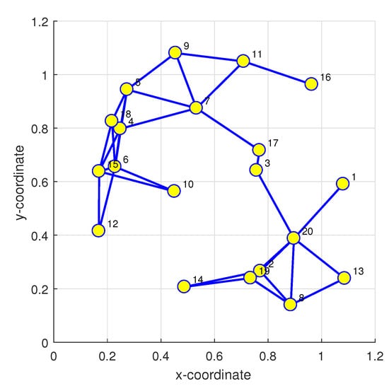 Algebraic graph theory is an important branch of graph theory, which mainly uses algebraic methods and results to study related scientific problems by graph theory []. Therefore, algebraic graph theory is the theoretical basis for the analysis of IWSN. This means that each intelligent node (agent) is the vertex of the graph and the edge in the graph represents the communication structure between agents []. In order to study the topological construction and topological properties about intelligent network, some matrix theories about graph theory are introduced, which main include the adjacent matrix of a graph, correlation matrix, and the Laplace matrix, etc. []. Furthermore, in the theory of algebraic graph, one of the main research areas is whether and how the topological properties of graphs can be reflected by the algebraic properties of these matrices, so that the algebraic properties of these matrices can be studied by using matrix theory []. Then, the topological properties of IWSN are obtained. Particularly, based on algebraic graph theory, the research on consensus protocol and cooperative control of multi-agent network system is a hot and difficult point in intelligent network system [].