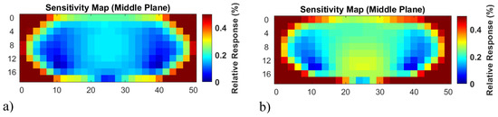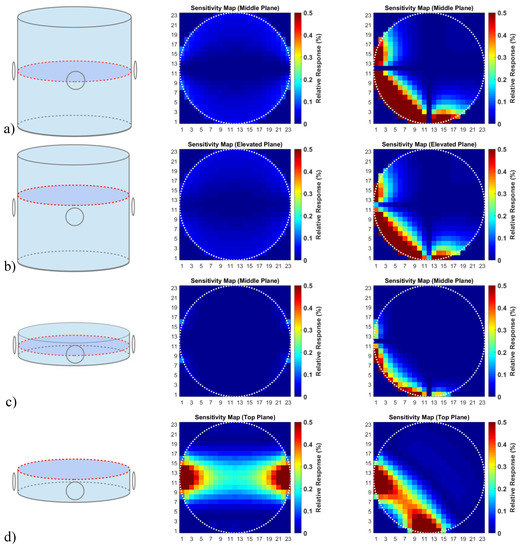 Typically, in the annular MIT setups that have been reported in previous studies—in which multiple transmitters and receiver coils are arranged around a low conductive saline cylinder [1,2,4,5,6,7,8,9]—the CAS becomes virtually zero [2,3] (Figure 1a,b). This problem is often bypassed by using a shallow conductive saline cylinder, where the inserted perturbation approaches the more sensitive top and/or bottom plane (quasi-2D [1,2,4,5], as seen in Figure 1d) or, alternatively, by only using the signals that originate from perturbations near the sensitive circumference [4,6,7,8,9] (Figure 1a–c). The signals are calculated using Equation (1), i.e., with the differential eddy currents in the conductive volume and the virtual vector potential of the receiver. The methods used to calculate the maps are described in Section 2.3 and Section 2.4. Only one excitation coil and two receiving coils at characteristic positions are shown here to demonstrate the general effects. 3D imaging requires many more coils around the conductive cylinder and at different heights [10]. However, a poor CAS remains a problem for all other pairs of transmitter and receiver loops.