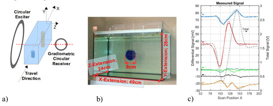 More closely related to the MIT geometries discussed in this article, Igney et al. [11] described a planar array MIT with exciter and receiver coils in a gradiometric arrangement. Our recently reported MIT scanner [12] is still technically similar to the methods described therein, and an experiment (Figure 2) highlights the addressed problem with the central region of a body, qualitatively related to the weak CAS, shown in Figure 1. In this experiment, a test body travels linearly through an opposing and planar arrangement of a single exciter coil and a gradiometrically aligned receiver coil (parallel to the yz-plane, as seen in Figure 2a). The test body (Figure 2b) with dimensions related approximately to a human torso is a 33-litre saline bath (0.8 S/m) with an immersed 0.27-liter void (sphere with 0 S/m). The sphere is steady with respect to the travelling saline bath. Figure 2c presents the differential signals (the local sensitivity) obtained from the measurements with and without perturbation. The relative volume of the perturbation is 0.82% and higher than applied for the maps in Figure 1. For the general approach, the volume center (green lines), the face-centered position close to the lateral surface (red lines), and the face-centered positions toward the excitation (blue lines) and receiver (yellow lines) surface are the positions representing the void. The response from the center of the volume (green lines) is weaker than the other differential signals. The center signal is indistinguishable from the noise floor (black line). Thus, virtually no information is obtained from the center of the volume, in contrast to the other positions near the surfaces. It is important to note that the signal-to-noise ratio (SNR) for the measurement, shown in Figure 2c, already approaches a well-performing 60 dB, as further described in Section 2.1.