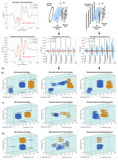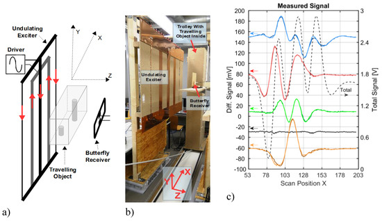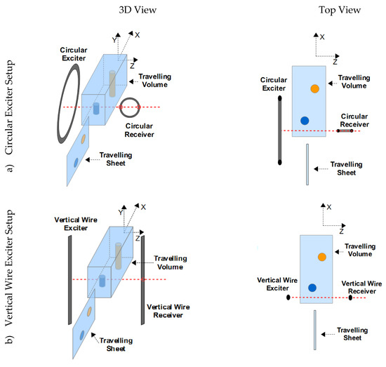 The detailed analysis and proposed improvement are presented via three different inductor geometries of the MIT scanner (Figure 3). In each of the three setups, the conductive body (Sheet or Volume) travels 256 cm in the x-direction through the gap between the exciter and the receiver. The receivers are gradiometrically aligned for the cases in Figure 3a,c. These cases, which are also presented experimentally, require a virtually perfect suppression of the primary signal in the receiver coils. Gradiometry is not required for the scenario in Figure 3b, since this setup is only theoretically examined.